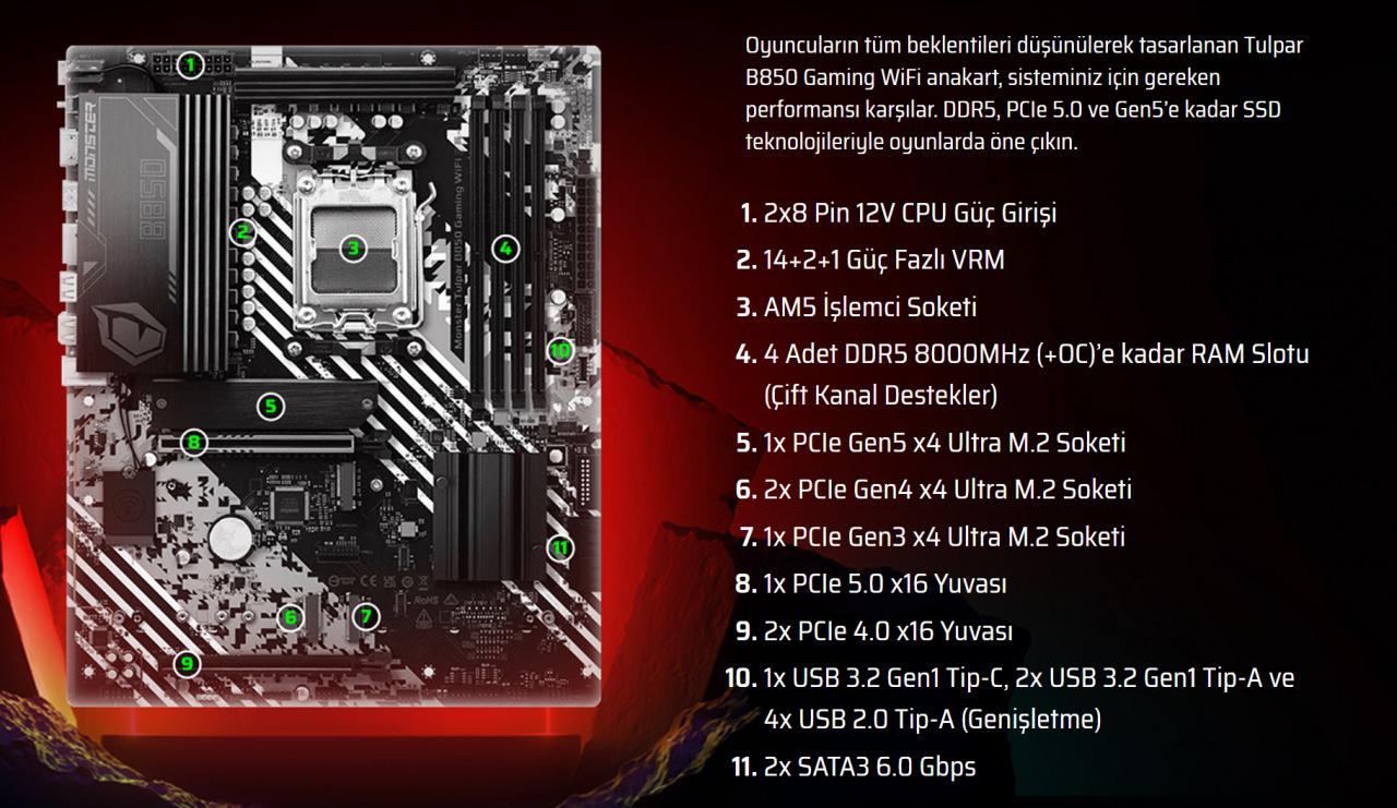 Tulpar TD3 V1.1.5’te kullanılan Monster B850 Gaming WiFi anakart, sistemin en güçlü bileşenlerinden biri. AM5 soket yapısı sayesinde yeni nesil AMD işlemcilerle uyumlu olan anakart;