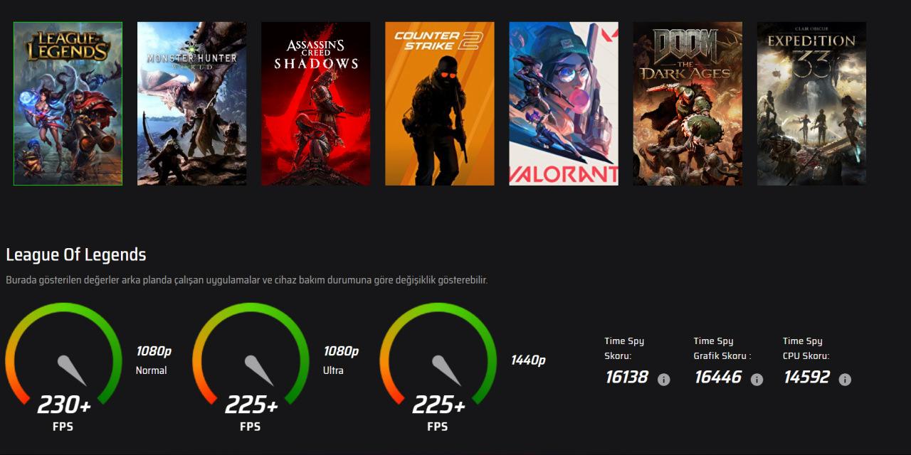 Monster’ın paylaştığı test sonuçlarına göre Tulpar TD3 V1.1.5, rekabetçi ve popüler oyunlarda oldukça yüksek kare hızları sunuyor: