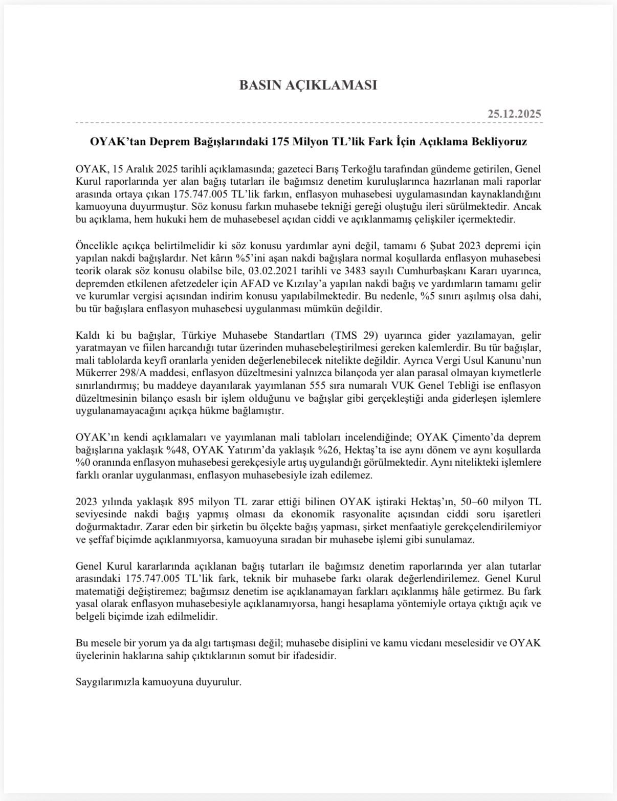 Konuya ilişkin OYAK’tan açıklama gelirken “Genel Kurul raporlarında yer alan bağış tutarları ile bağımsız denetim kuruluşlarınca hazırlanan mali raporlar arasında ortaya çıkan 175.747.005 TL’lik farkın, enflasyon muhasebesi uygulamasından kaynaklandığını kamuoyuna duyurmuştur. Söz konusu farkın muhasebe tekniği gereği oluştuğuna ilişkin sürmektedir. Ancak bu açıklama, hem hukuki hem de muhasebesel açıdan ciddi ve açıklanmamış çelişkiler içermektedir” ifadelerine yer verildi.