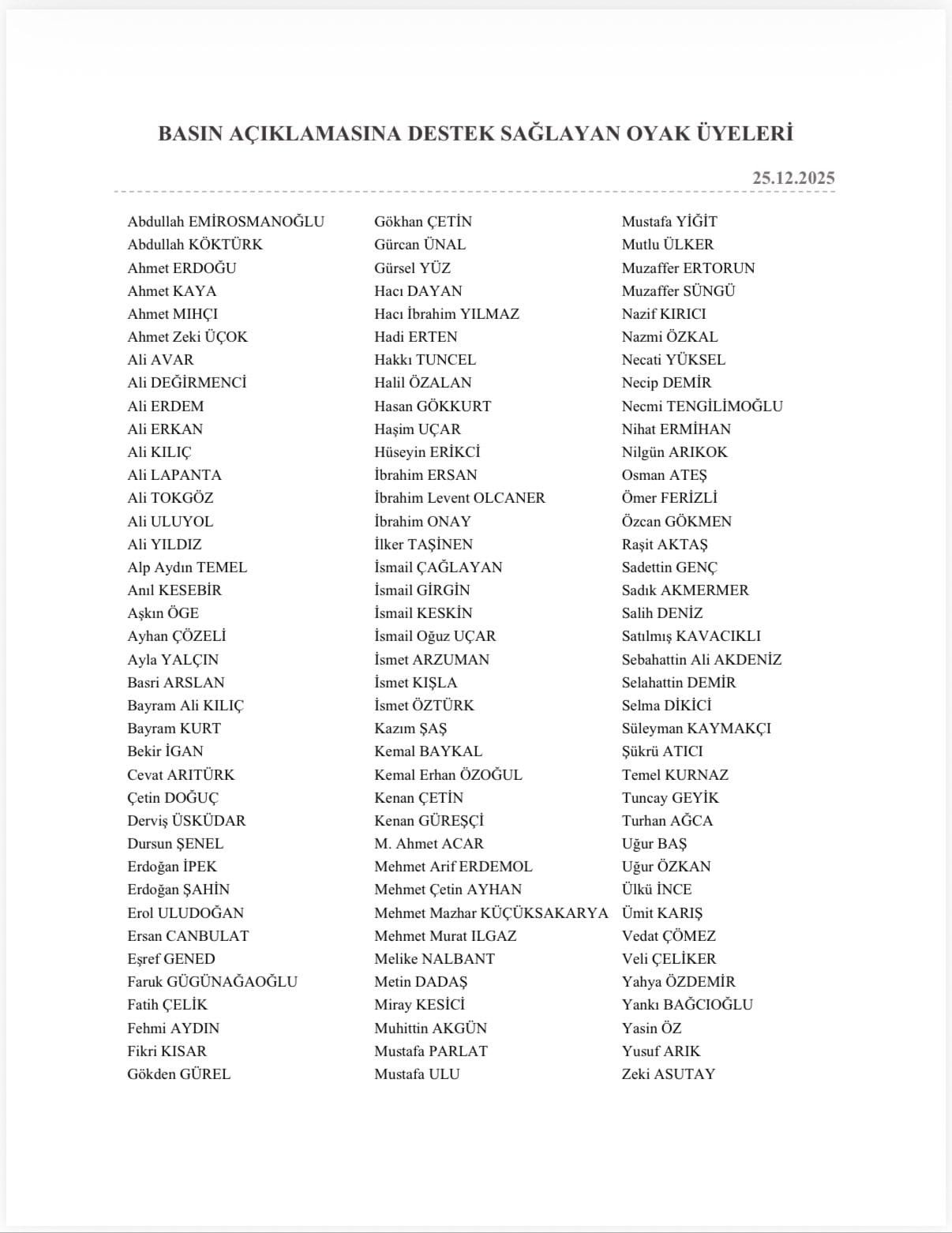 OYAK tarafından yapılan açıklamanın devamında ise, söz konusu basın açıklamasına destek veren isimler şu şekilde sıralandı: